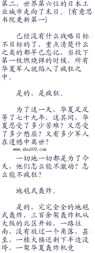 三百余架华夏轰炸机散布在大阪城的上空,恍若死神张开了黑色斗蓬,将死亡的气息投向了大地,复仇的火焰已经开始燃烧了。