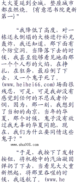 高温蔓延,灼热的气流与冷空气形成了强劲的对流风,火借风势,燃烧的更加凶猛了。没有人去灭火,因为,这跟自杀没什么区别,所有的小鬼子都在逃命,企图从死神的手底下抢回一条命来,可是,无数被大火吞噬的尸体告诉着他们,这一切,只不过是徒劳而已。