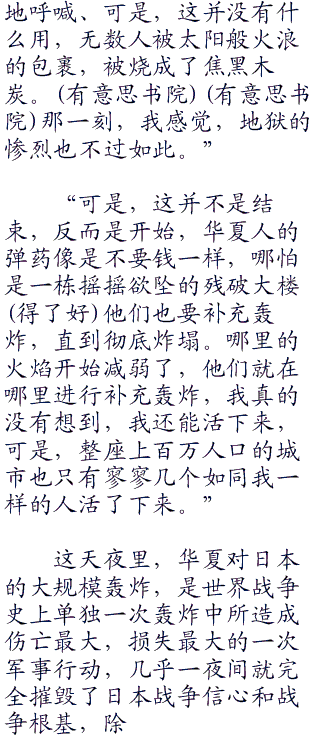 华夏第一,第二攻击纵队,总计一千六百架次的各型轰炸机,发动了有史以来最大规模的战略轰炸行动,上万哼吨各型燃烧弹被投入了日本的重工业城市。