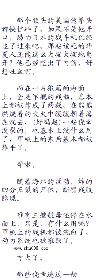 在火焰的怒吼声中,一艘老毛子的护卫舰直接被炸的跃出了海面,破碎的钢板,焦黑的尸体像是下饺子一样落入海水中。一条巨大的裂缝快速沿着护卫舰的龙骨处蔓延着,钢铁发出了痛苦的撕裂声,只是看看几秒的时间,在岸上的洋鬼子和小鬼子惊恐的眼神中,这艘护卫舰最终哗的一声断裂成了两截,重重地摔在了海面上。
