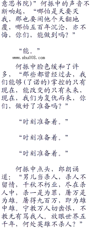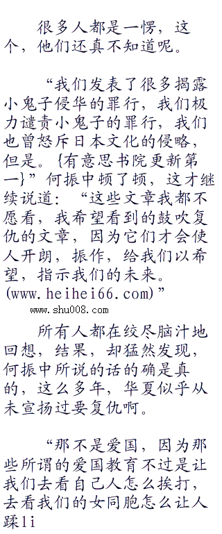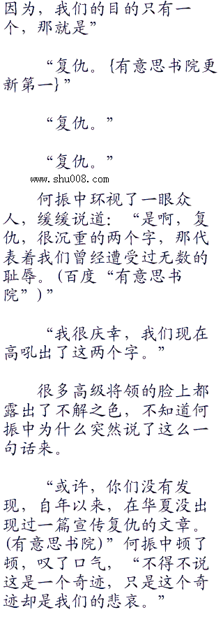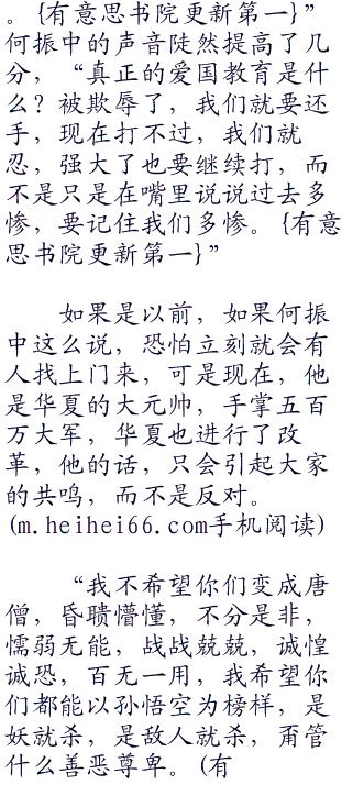 “似乎,我们被人宰割已成惯性。”何振中的声音陡然提高了很多,充满了激昂之势,“战争!战争!唯有残酷的战争才能治愈我中华民族的百年沉疴,唯有铁血的战争才能恢复我中华民族的千年荣耀!”