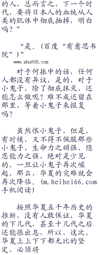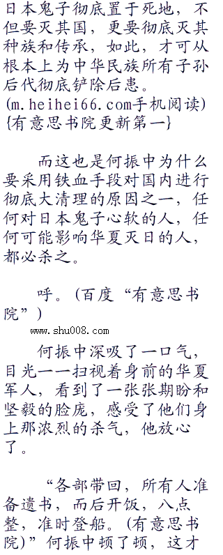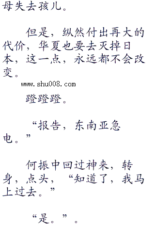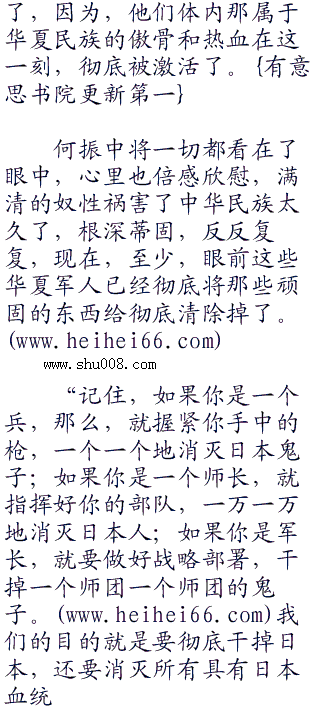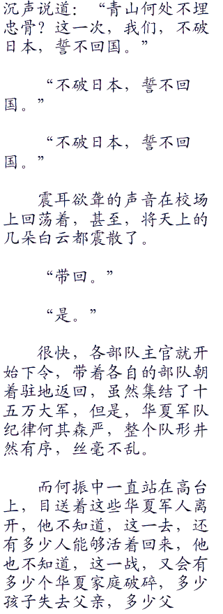 “很好。”何振中点头,大声说道:“我很高兴听到你们的回答,这才是我泱泱华夏的兵,即使过去一万年,我们也要复仇,哪怕敌人每死一个,我们就死两个,我们也要复仇,即使会使中华民族灭亡,我们也要复仇。我们是五千年历史的泱泱大国,是龙的传人,怎么能丢掉我们中华民族的傲骨和尊严?所以,我们宁做复仇鬼,也不做苟安人。对也罢,错也罢,我们只管复仇罢,即使复仇是犯错,那么,我们不介意一错再错。”