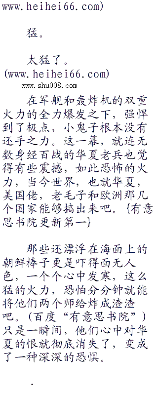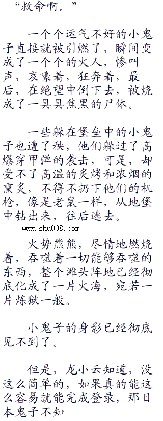 铺天盖地高爆炸弹落下,死亡的光焰交织成了一面死亡的大网,将岸上的鬼子阵地彻底笼罩。顿时,刚刚还耀武扬威,击退了两个朝鲜师的小鬼子就变成了缩头乌龟,只能缩着身体,祈祷着他们的天照大神保佑。