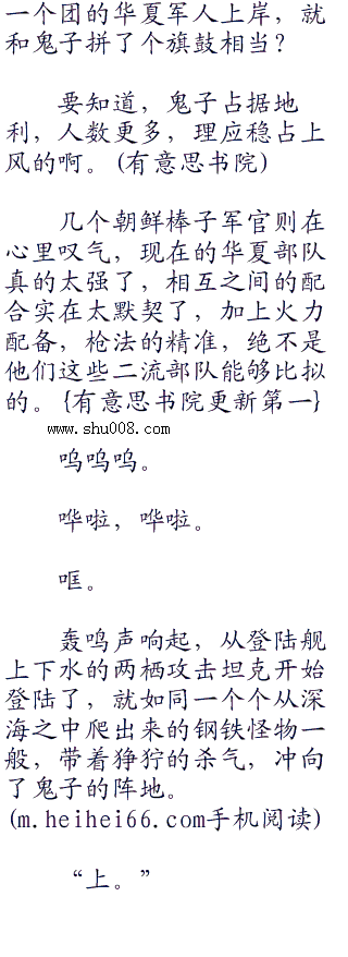 当看见悬挂着血染的华夏军旗,当隐隐约约看见那些身穿绿色军装的身影的时候,正在尽情地屠杀着朝鲜棒子的小鬼子就像是老鼠见了猫一样,立刻就萎了,不少人都惊慌地大叫了起来,甚至,一个鬼子新兵扔下枪,转身就朝着后面屁滚尿流地跑去,就仿佛看见了恶魔一般。