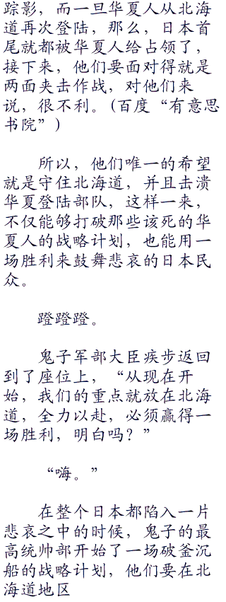 所有小鬼子做梦都没想到,居然会出现高级将领临阵叛逃的事情,直接导致了他们的战略计划一败涂地,让华夏人轻松登陆,站稳了脚跟。这些小鬼子终于体会到了当年华夏的痛苦了,三十万东北军不战而退,将东三省地区拱手相让。