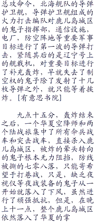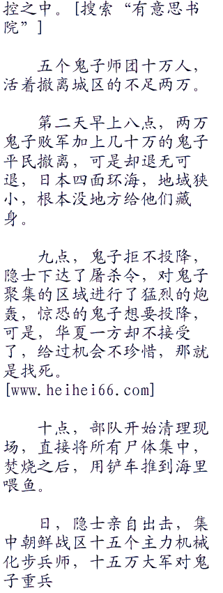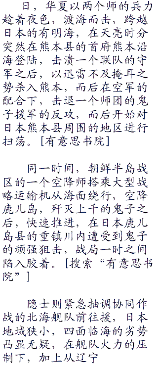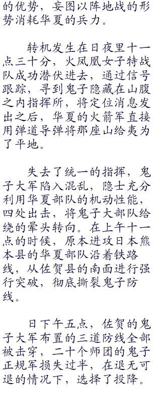 随着东京骚乱的平息,整个日本的局势似乎也渐渐归于平静,东线战斗集群从北海道登陆,将鬼子围困之后便在何振中的命令下,开始巩固周边防线,对包围圈中的一百万鬼子精锐部队进行彻底地封锁。