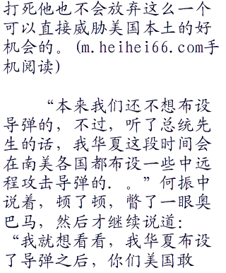 “好,就算你华夏要在南美地区驻军,但是,你们必须保证不能布设中远程攻击导弹。”奥巴马退让了一步,因为他知道,这些该死的华夏人是无论如何也不会放过进入南美地区这个机会的,换了是他,