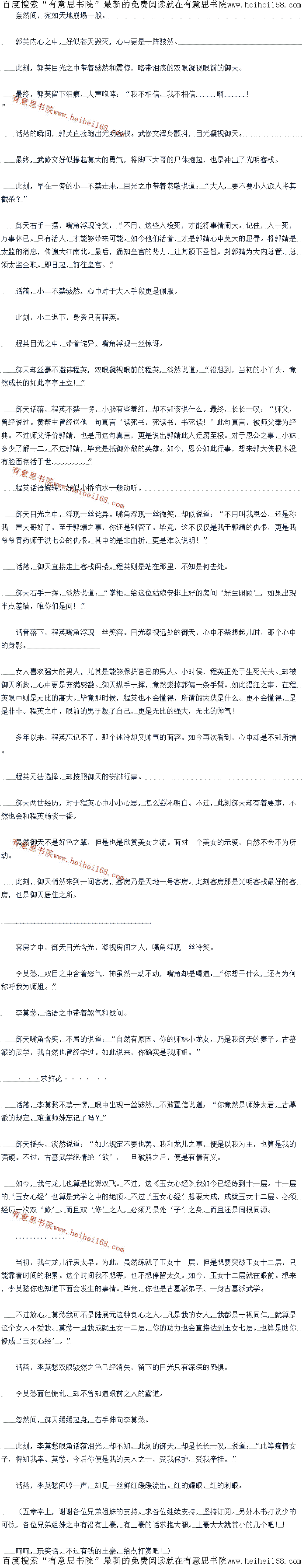 如今,我与龙儿也算是比翼双飞。不过,这《玉女心经》我如今已经练到十一层。十一层的‘玉女心经’也算是武学之中的绝顶。不过‘玉女心经’想要大成,成就玉女十二层。必须经历一次双‘修’。而且双‘修’之人,必须乃是处‘子’之身,而且还是同根同源。