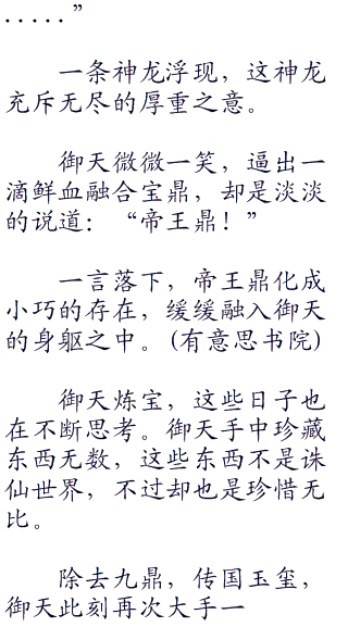 一瞬间,御天的玉清灵力涌出,‘帝王印17’化成一道流星融入御天身躯。