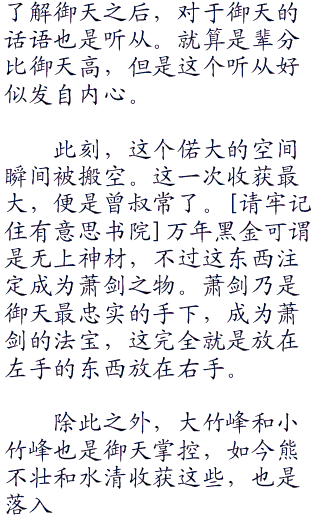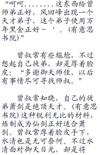 水清说着,曾叔常忍住心动,却是微微一笑:“水清师姐所言甚是,这万年黑金还是归御天师侄所有。”