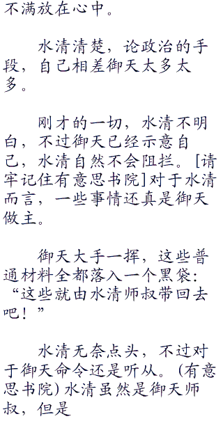 水清满意的点头,御天却是一阵无奈,这是哪跟哪啊!