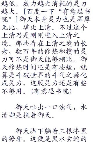 黑水玄蛇堪比太清之境,甚至一些普通的太清之境对于黑水玄蛇也是无可奈何。不过黑水玄蛇完全就是靠着身躯战斗,不会使用道法,不会使用仙法........这完全就是一个大块头。这些家伙面对御天,还是老老实实被控制吧。