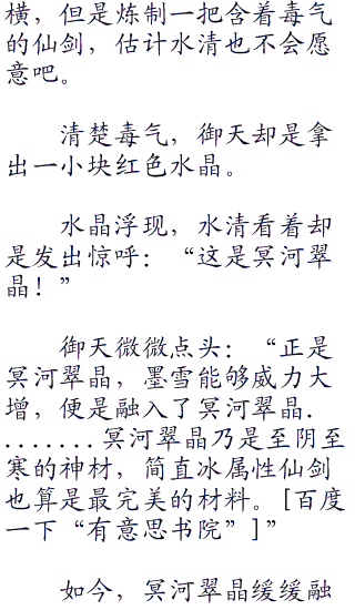 此刻,御天凝视一把仙剑,仙剑充斥一股幽冷。这仙剑乃是水清仙剑,水清仙剑乃是使用落雨石炼制,也算是一种水属性仙剑。不过落雨石并不是多么珍惜的存在,为此这仙剑并不是多么强大,也就等同龙首峰齐昊的寒冰剑。