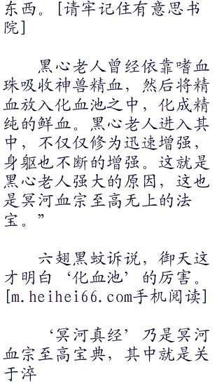 御天缓缓走动,六翅黑蚊却是发出一阵笑声:“呵呵.......主人.....这就是池,也称为化龙池。不过这个血池并不是化龙,这是一种修炼至宝。黑心老人的嗜血珠一共有着两部分,其中一部分便是嗜血龙珠,一部分便是化血龙池!其中嗜血珠的吸血能力强横,能够吸收无尽的精血储存。化血池则是能够淬炼这些血液,将其化成天地宝材。这两者相合,那才是完整的嗜血珠,如今存在外界的嗜血珠仅仅是残缺的