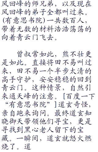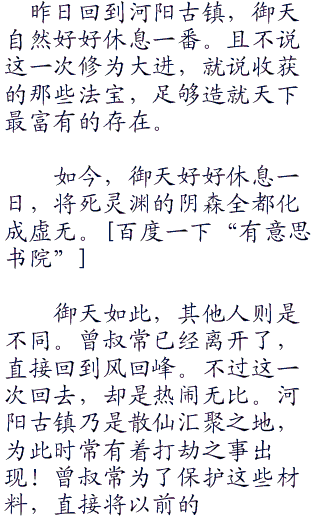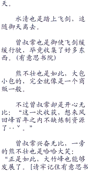 水清则是轻松,双手没有任何东西。这一趟,水清获得冰晶剑,也吞噬大量的阴灵。为此水清没有收集材料,反而凝视御天充斥满满的情意。