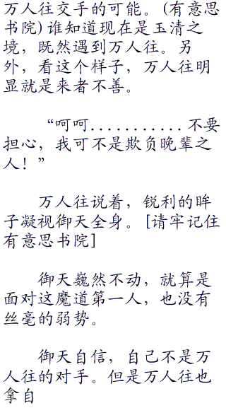 御天也是凝视万人往,如今御天的实力对上万人往还真是无可奈何。万人往的实力,明显就是太清之境,这种实力可不是御天能够对付。御天不是没有想过和万人往对上,但是御天清楚只要自己成为上清之境,应该有着和