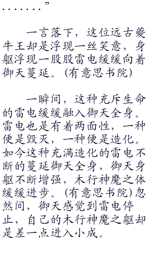 雷电不断肆虐,却是没有伤到御天半分。磅礴的雷电不断的涌入,御天的身躯却是不断的增强。