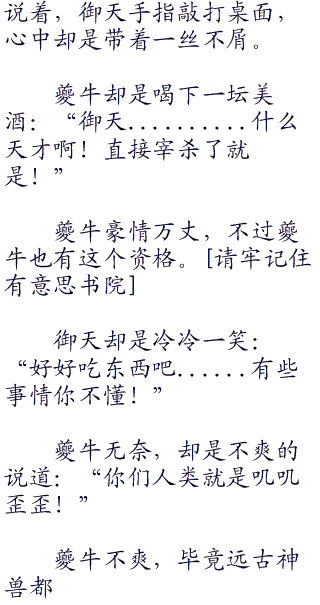 御天坐在一旁抿茶,夔牛则是站在一旁。完全就是四肢发达头脑简单的夔牛,坐在那里吃这美味的食物。