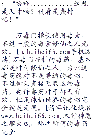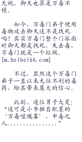 御天清楚,这男子出现的瞬间,御天就知晓这人乃是万毒门弟子。御天敏锐的嗅觉就嗅到了一股淡淡的甜腻异香,与此同时,御天也感觉到一些肉眼无法得见的异物想要钻进他的体内。