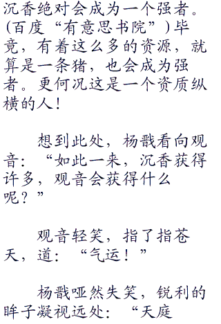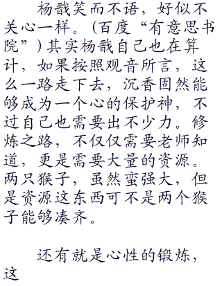 杨戬瞬间知晓观音在说谁,三圣母的儿子不就是说沉香吗!不过沉香如何,他还这没有放在心上。固然沉香有着妹妹
