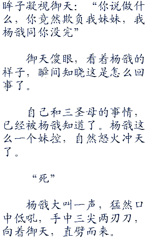 想起御天,杨戬就是一阵恼火。此刻,御天竟然和自己妹妹好上了,这如何不令杨戬愤怒。杨戬在天庭之内,自然知晓御天所作所为。不仅仅和碧霄,琼宵,有着不清不楚的关系。更是知晓,御天在人间界还和青丘国的公主有些关系。