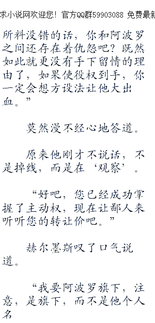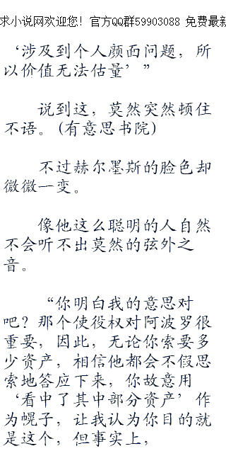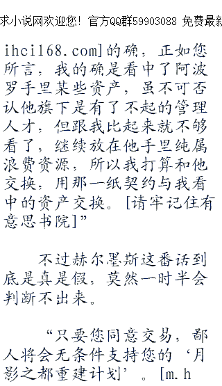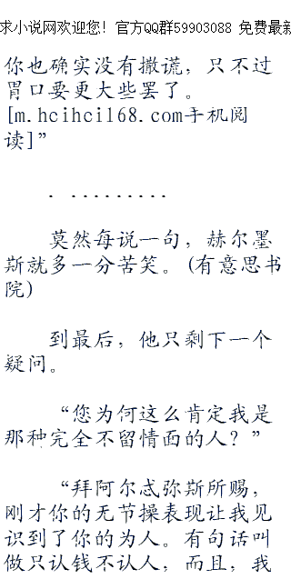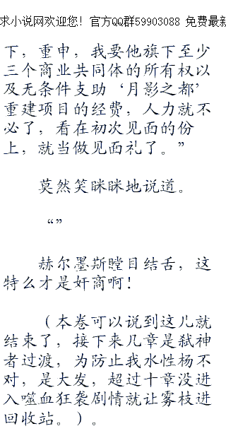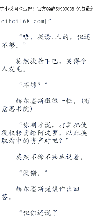 ;;;;赫尔墨斯心有余悸地拍了拍xiong口,然后清了清喉咙说道:“尊敬的莫然阁下,鄙人怀着诚意而来,希望与您做一笔交易。”