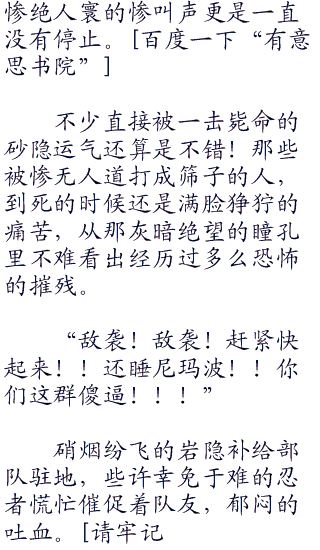 砂隐村感到不会有人袭击补给队伍虽然异想天开,但却是符合情理,木叶的高端战斗力不过那几个,且都被各方的战局缠住无法脱身,三代本人坐镇木叶,除非是三代老头亲自来偷袭砂隐,不然绝对不可能有其他的影级强者来伏击他们。