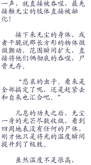 巨型火焰群迎面吹来,温度极高,红彤彤的一片,将天空烧得通红,火焰群之后的无尘更是全身被深红色渲染,如同火焰之神,排山倒海的阵势犹如沙尘暴般的遮天盖地,场景甚是壮观华丽。