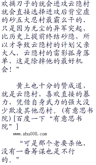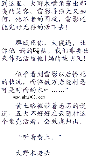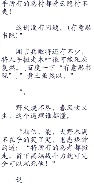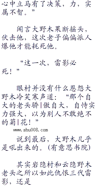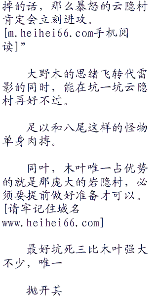 起前些日子的事情,大野木气不打一处来,脑细胞加速的运作思考,一个坑死三代雷影的计划缓缓成的实力强到可以和八尾肉搏,不容小觑,必须要做到滴水不漏,还要以防云隐村的反扑才行  回想,虽然对三代目雷影很是不屑,但他也不得不承认,对方的实力强的不科学,