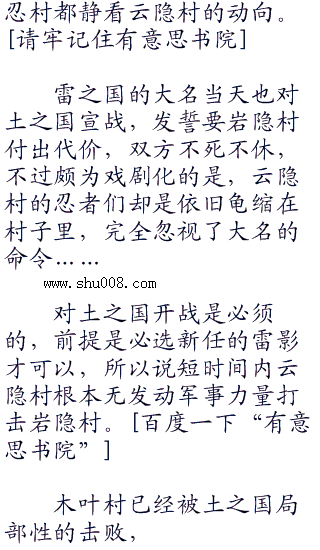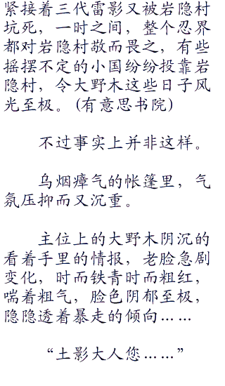 三代目土影的儿子黄土带领数万岩隐村的忍者将雷影围攻而死,次消息如飓风般的肆虐全世界,令本就诡异的第三次忍界大战再次悬念几分,所以的
