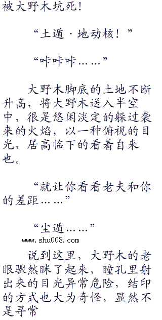 大野木眼见无尘肆无忌惮的屠杀己方忍者,顿时火冒三丈,怒火将他的理智全部烧毁,心中暴怒至极,暗骂晓故意坑岩隐村。