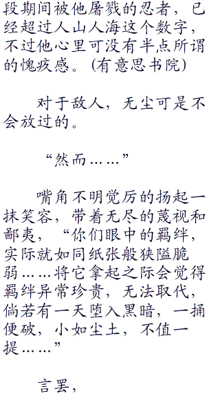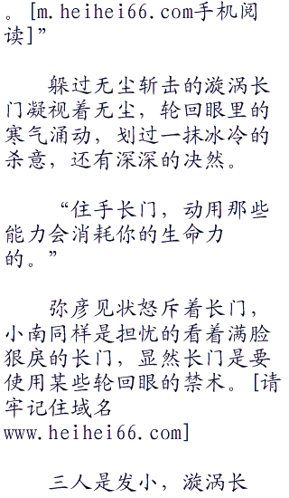 无尘心里暗骂连连,由于以前使用瞳力过度的原因,他现在已经无法使用万花筒,当然使用的话也不是不可以,但这次之后,恐怕会彻底的失明。