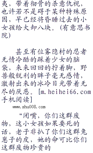 嚣张至极的阴笑声响彻开来,桀骜的语气高傲不逊,几名雾隐村的忍者不屑的看着脚下的小女孩满脸的鄙