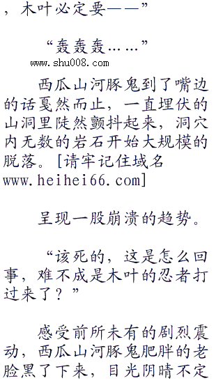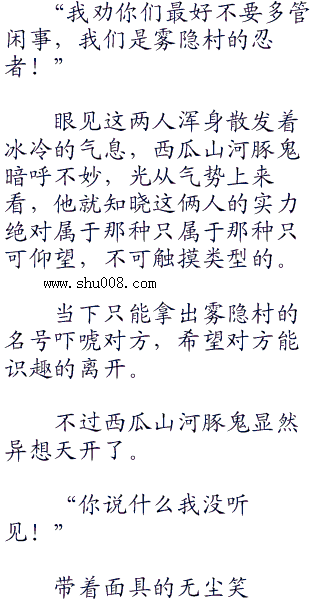 借着倒映在岩壁上的倒影,可以清晰的看到几个身材壮硕,凶神恶煞的大汉,从其打扮来看应该是雾隐村的忍者无疑。