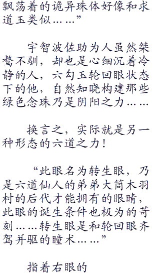 灵儿变化的宇智波佐助,愣愣的看着全身被绿色查克拉包裹的无尘,他自然没有见过传说中的转生眼,尤其是无尘身后飘荡着的绿色眼珠,令他有种颇为熟悉的感觉。
