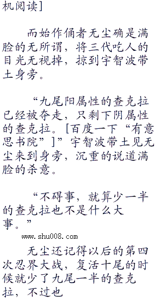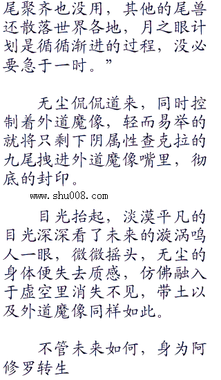 轮回写轮眼和转生眼变成正常人类的眼睛,无尘眼睛骤然眯了起来,察觉九尾急剧减少的查克拉,细细感受了一番之后,无尘这才发现九尾的阳属性查克拉消失,就好像是被人抽走一般。