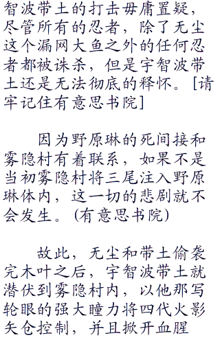 这期间发生不少的大事,五大国的四大忍村都到了血霉,被无尘袭击惨不忍睹,尸横遍野暂且不说,甚至还被不少的小国偷袭打闷棍。