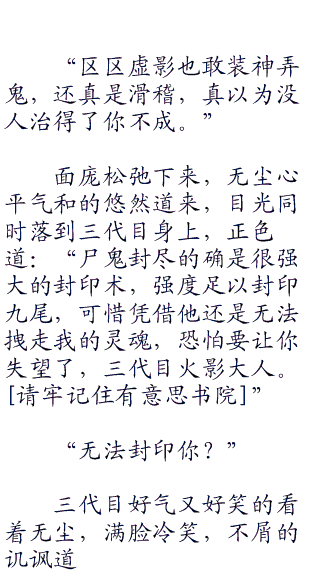 浑然不惧的盯着三代火影身后的虚影,无尘娓娓道来,语气宁静而又淡泊,目光俯视着要比自己矮个头的三代目火影,古