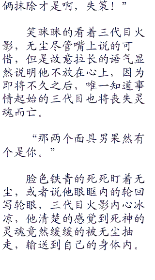 三代火影紧紧的抓住无尘使他无法动弹,浑身的力道都集中右臂。