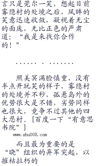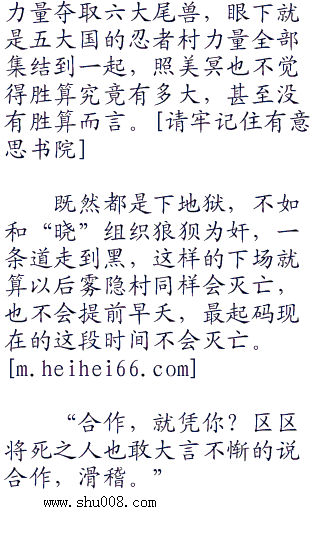 五大忍村虽然还没有彻底的联合,但是共同对付“晓”的策略是同样的,水影照美冥亲自到场就说明一切,五大国都派遣各方的人马伏击“晓”组织,只要坚持那么一会的时间就会等到援军。