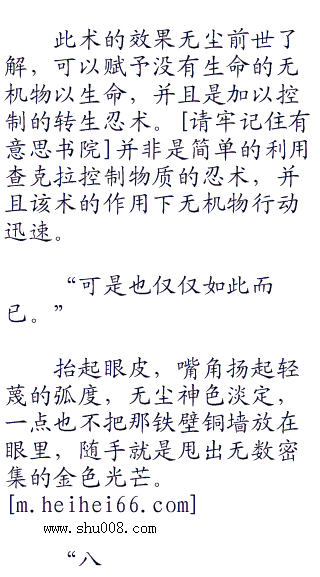 兜只是单纯的横眉以对,对无尘的这番话是嗤之以鼻,他不但有“水化之术”这种能偶轻易无视物理的忍术,除此之外还调查了漩涡香燐的身体,将漩涡一族身体的细胞植入自己的身体,只要受伤就能恢复。