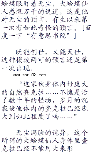 细小的蛤蟆眼锁定无尘,深作仙人流露出洒然之色。悠然回首,转眼即是八百余年,纵观一生,光明磊落儿孙满堂,纵使一死,亦是无悔矣。