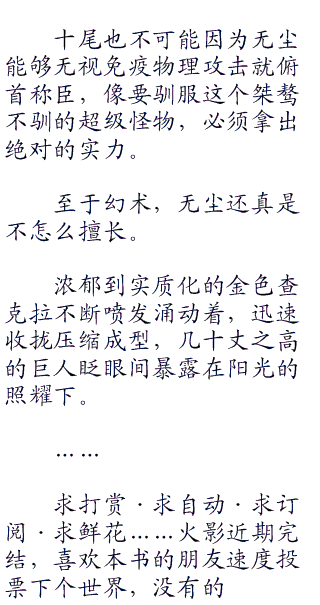 光束汇聚于十尾的瞳孔面前,无尘嬉皮笑脸的望着眼前的怪物,直视着十尾猩红色的狰狞眼球,右腿光芒大放,被璀璨的金光所吞噬。