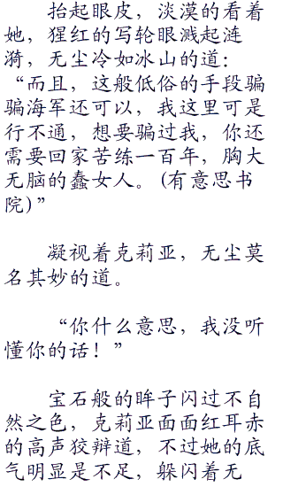“果然如此,纵使眼前这个自称克莉亚的女人受过良好的教育,骨子里高人一等的思想也是根深蒂固,不容违背的唯我独尊性格也没有改变。”