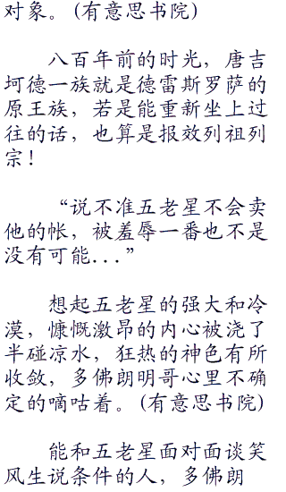 多佛朗明哥闻言神色凝固,眉头深深挤在一起,继而低下头来满脸思索,眼里时常闪过灼人的精茫。