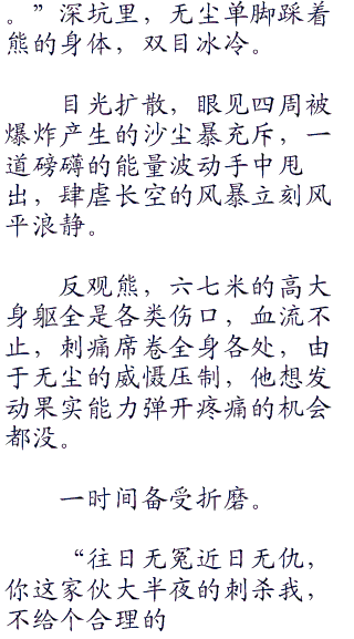 “阿拉……不愧是熊啊,这反应能力...啧啧...”无尘暗自咂舌,换上克洛克达尔,恐怕已经天人永隔。