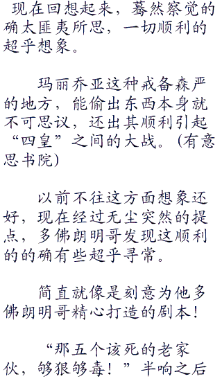似乎想起什么,无尘脑海里骤然划过一抹灵光,敏锐的意识到并非他想象的那么简单,玛丽乔亚的东西多,佛朗明哥纵使有通天的手段,也无法轻易的偷出来,更别提全身而退,这本就是极不合理的事。