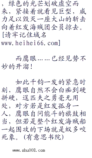 目露精光,察觉红发香克斯破绽百出,鹰眼提着手中的黑刀扑了过去,虚空荡起涟漪,翡翠色的凛然剑气朝着巍然不动的红发香克斯碾压了过去。