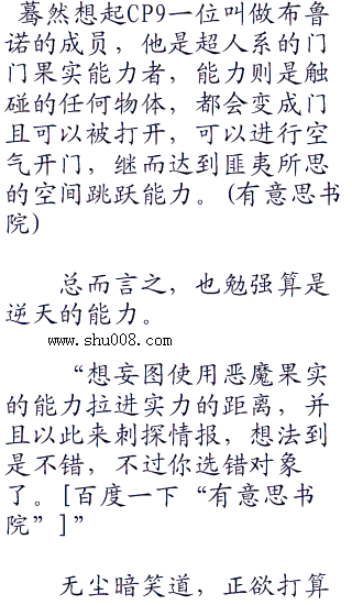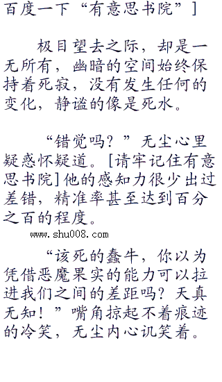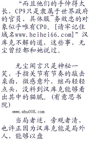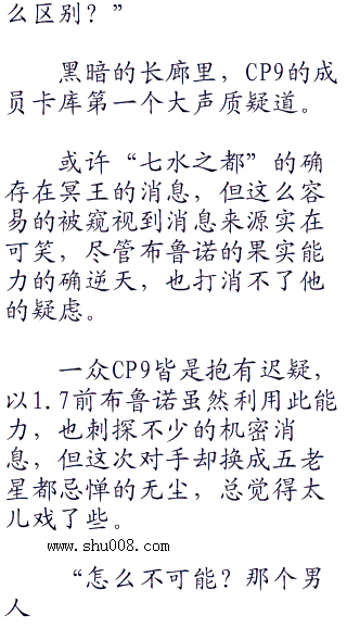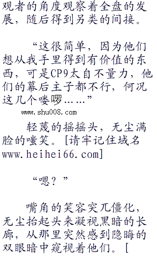 黑暗中的无尘脸上冷漠逐渐收敛,转换为单调“五九零”的嘲讽,深邃的黑眼珠写满睿智,冥冥之中已经猜测cp9突然造访为何意。