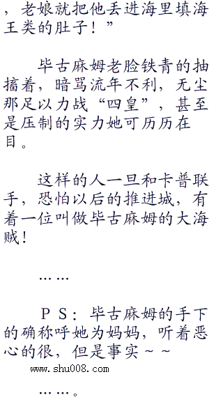 期间值得一提的是,白胡子手下第四番队的队长萨奇,前来暗中窃取暗暗果实,被毕古麻姆发现轻而易举的击溃,并且撕掉对方一条手臂,连带着黑胡子也打得抱头鼠窜。